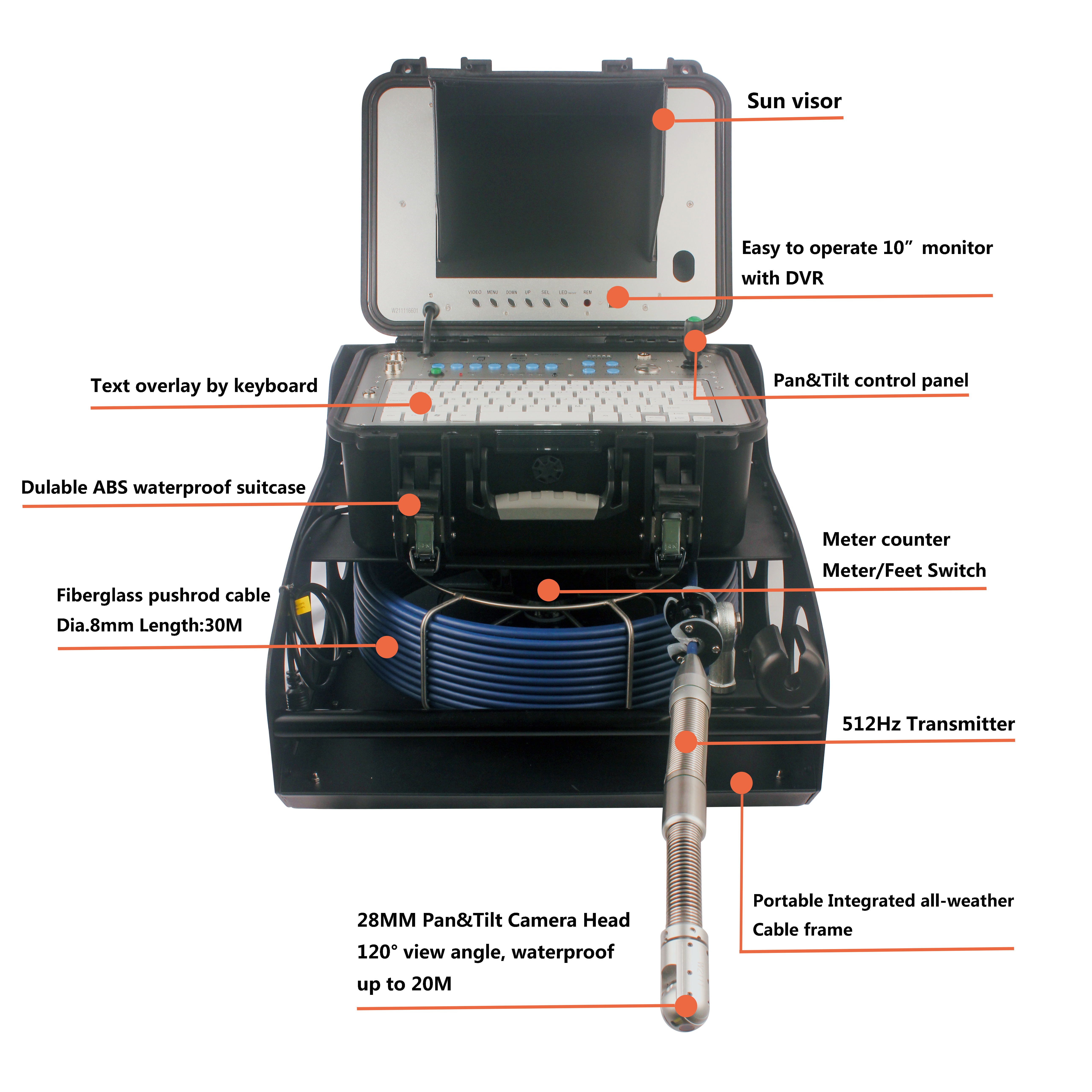 This model pipe drain sewer camera is one of the most small and durable Pan Tilt pipe inspection systems with compact design, which is well suited for inspecting sewers, drains, ducts, manholes, culverts, wells, and tanks.